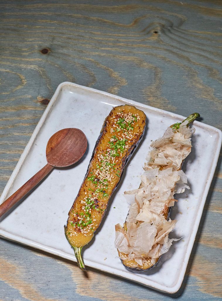 Die Aubergine herausnehmen und auf Küchenpapier abtropfen lassen. Die Schnittfläche mit Miso Sauce bestreichen und in einem Vorgeheizten Ofen bei 200°C Oberhitze für ca. 3 Minuten gratinieren.