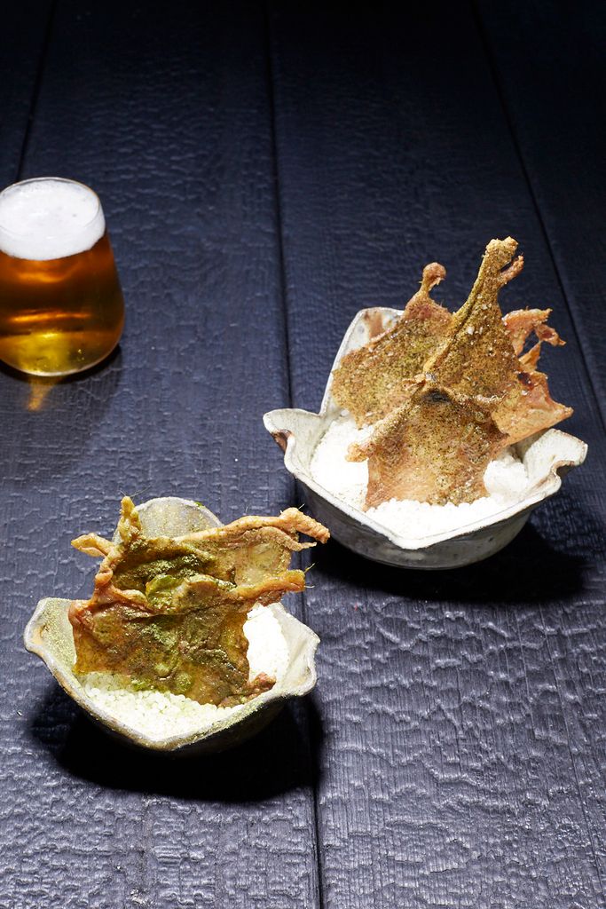 Die knusprige Hühnerhaut aus dem Ofen nehmen, mit Matcha Salz würzen und sofort servieren.