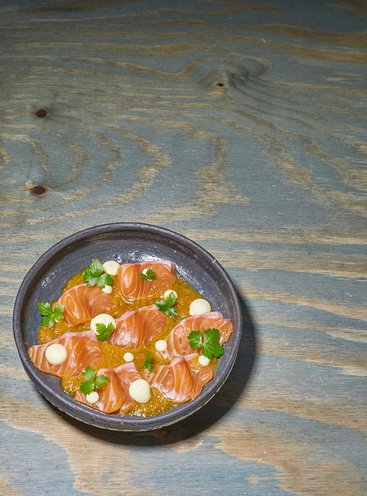 Lachs quer zur Faser in 3-4 Millimeter dünne Scheiben schneiden. Auf einem Teller anrichten und mit Sake Wafu Dressing und Trüffelmayo anrichten.