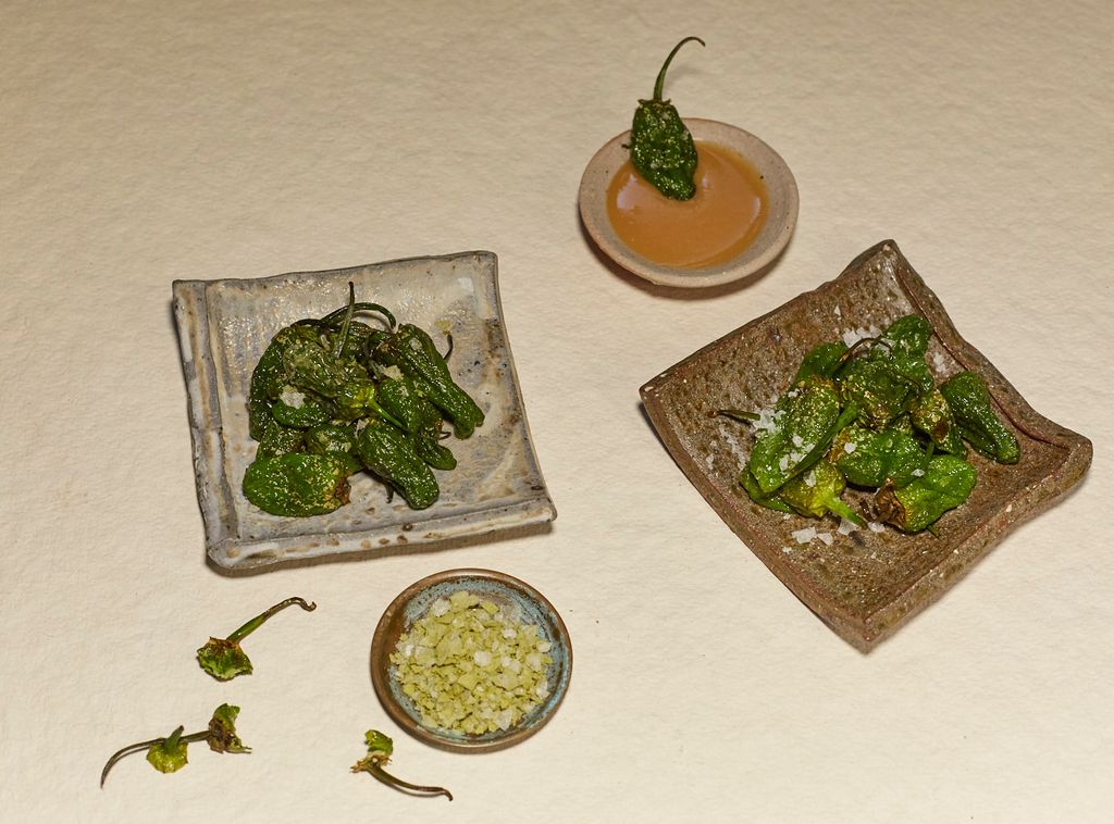 In einer großen Pfanne Pflanzenöl und Sesamöl erhitzen. Vorsichtig die Pimientos de Padrón portionsweise in die Pfanne geben und 2-3 Minuten braten. Ab und zu die Pimientos de Padrón mit einer Zange wenden. Sie sind fertig, wenn sich Blasen bilden. Mit einer Schöpfkelle herausnehmen und auf Küchenpapier abtrocknen lassen